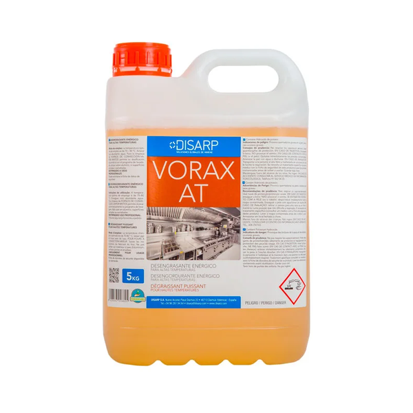 El desgreixador VORAX AT és un formulat de alta alcalinitat amb un gran poder desengreixant i emulsionant de greixos persistents i carbonitzats. Especialment dissenyat per a la neteja de planxes de cuina i forns, aquest producte ofereix un rendiment excepcional, augmentant la seva efectivitat si s’aplica en calent (màxim 80 ° C) sense desprendre vapors.