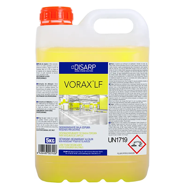 El desgreixador Vorax LF és un producte alcalí d’elevada concentració i baix en escuma, formulat especialment per a l’eliminació de greixos, olis cremats i brutícies resistents mitjançant màquina fregadora, equips d’alta pressió o aplicació manual.
