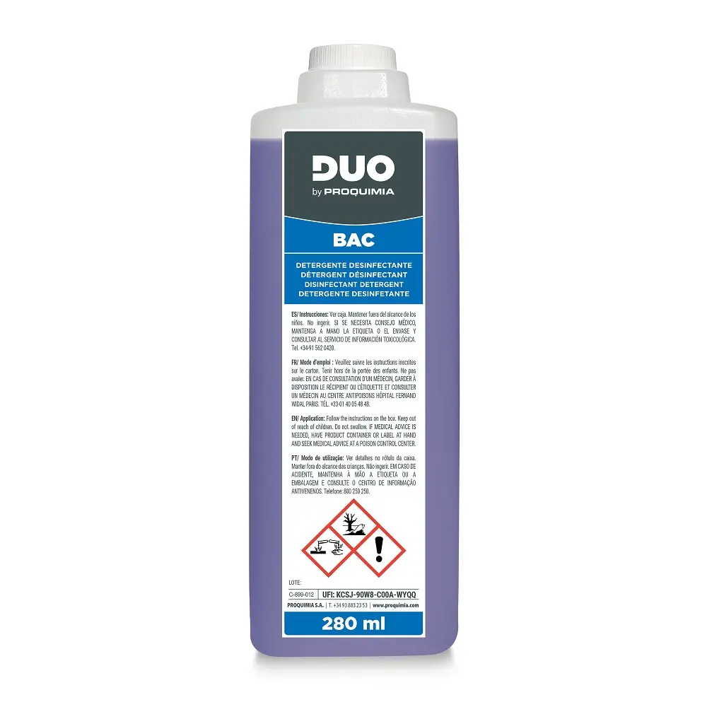 DUO BAC de Proquímia és la solució professional per a la neteja i desinfecció diària de superfícies, combinant eficàcia detergent, acció microbicida certificada i alt rendiment.
