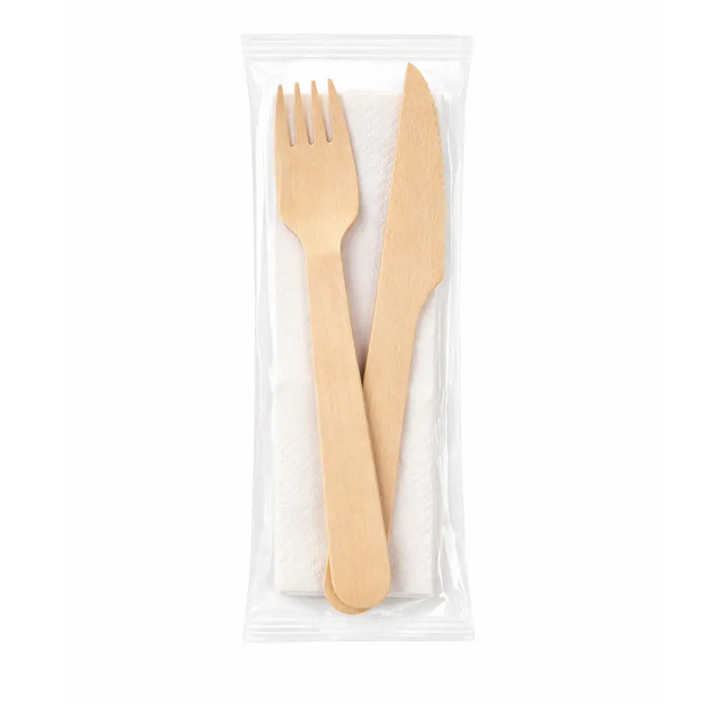 Inclou un forquilla, un ganivet i un tovalló, ideal per oferir als clients una solució higiènica i llesta per utilitzar en qualsevol tipus d’àpat.