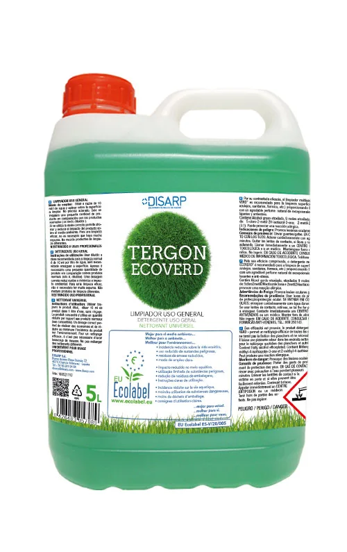 El Fregasuelos TERGON ECOVERD es un limpiador multiusos concentrado con etiqueta ecológica europea, formulado con materias primas alternativas para garantizar una mayor protección de la salud y el medio ambiente. Ideal para la limpieza de superficies duras como suelos, azulejos, sanitarios y fornica, proporcionando un brillo duradero y un agradable perfume natural con propiedades relajantes y antiestrés.